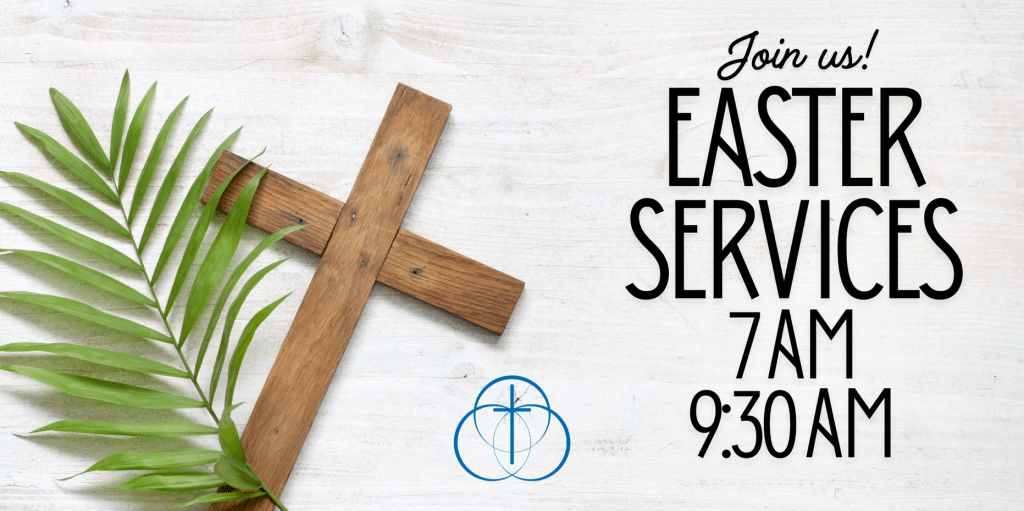Easter Sunday services will be held at 7:00 a.m. and 9:30 a.m., with breakfast served in between from 8:15 a.m. – 9:15 a.m. Everyone is welcome! Please note, there will be no Sunday School, Jr. Church, or staffed nursery. The nursery will be open as a cry-room, and activity bags will be available for children.